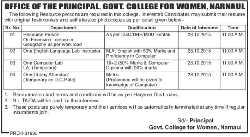 Office of the principal, Govt. College for Women, Narnaul requires Resource persons in this college. The Walk in Interview scheduled to be held on 28th October 2015.