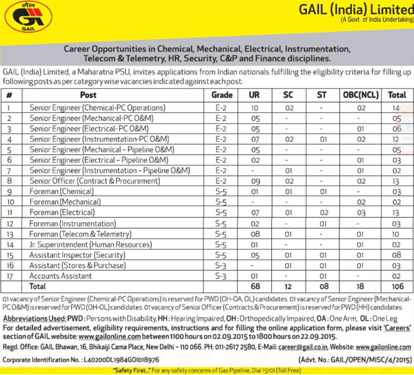 GAIL (India) Limited (A Govt of India Undertaking) Career Opportunities in Chemical, Mechanical, Electrical, Instrumentation, Telecom & Telemetry, HR, Security, C&P and Finance disciplines for fill up total 106 Vacancies. Eligible Indian Nationals apply online from 2nd September to 22nd September 2015.