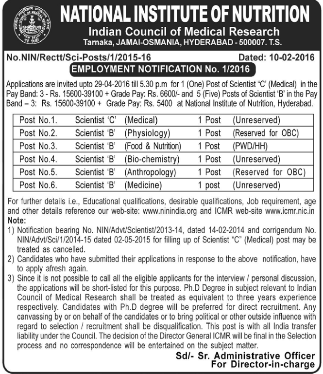 National Institute of Nutrition (Indian Council of Medical Research), Hyderabad invites applications for recruitment of Scientist 'C' (Medical) and Scientist 'B'. Eligible Persons apply on or before 29th April 2016.