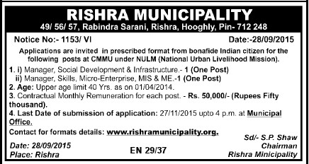 Rishra Municipality, Hooghly invites applications in the prescribed format from bonafide Indian Citizen for the following posts at CMMU under NULM (National Urban Livelihood Mission). The last date for submission of applications is 27th November 2015.