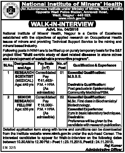 National Institute of Miners' Health (NIMH), Nagpur Walk in Interview for recruitment of Research Scientist (Medical) and Senior Research Fellow (SRF). The Walk in Interview scheduled to be held on 23rd and 24th November 2015.